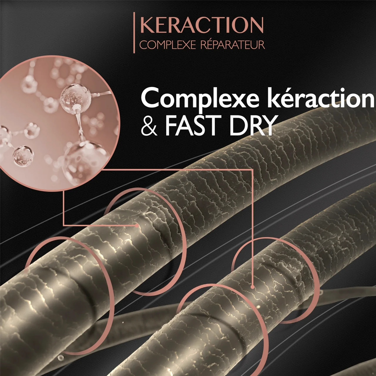 – Le complexe Keraction, une association de nutriments provenant de la Caroube et de protéines de Kératine végétale pour prévenir la casse et apporter douceur et brillance